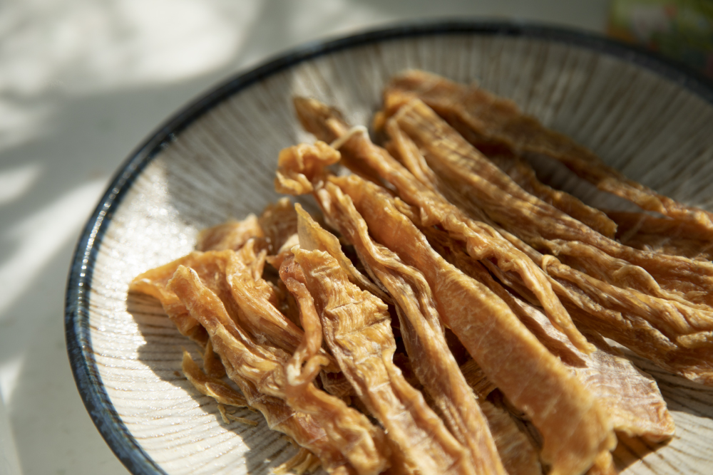 牛筋富含膠質及膠原蛋白,給狗狗從骨骼到皮膚的營養所需,經低溫烘培後,變得清新耐咬,幫助潔牙,是紓壓放鬆的最佳零食