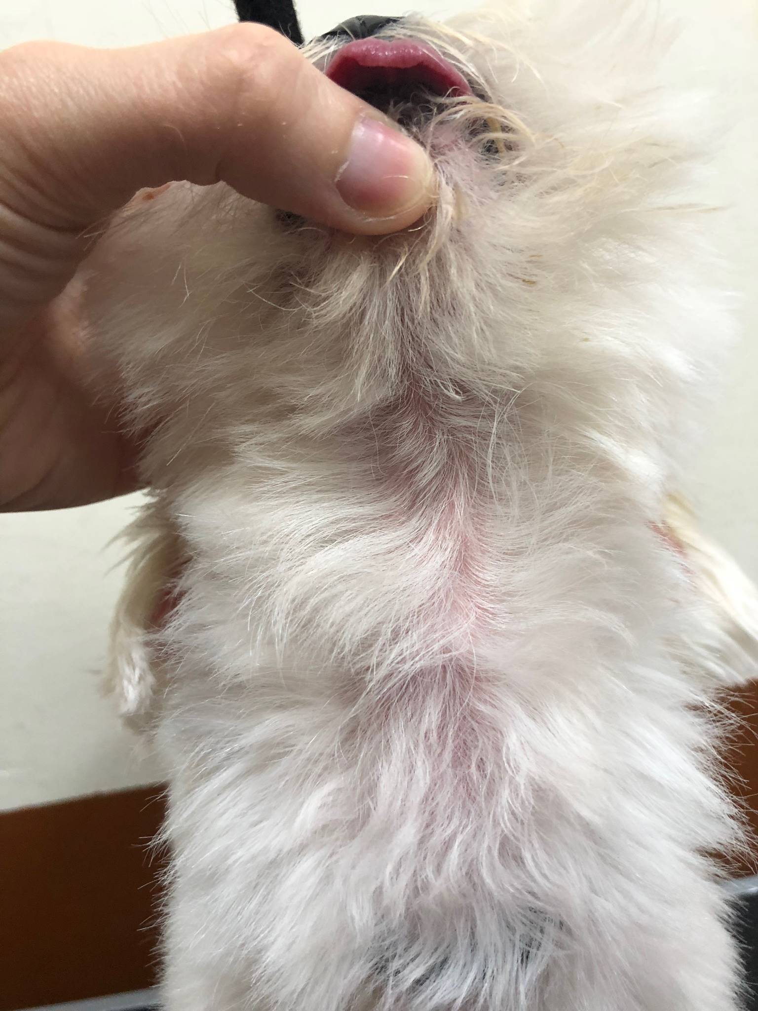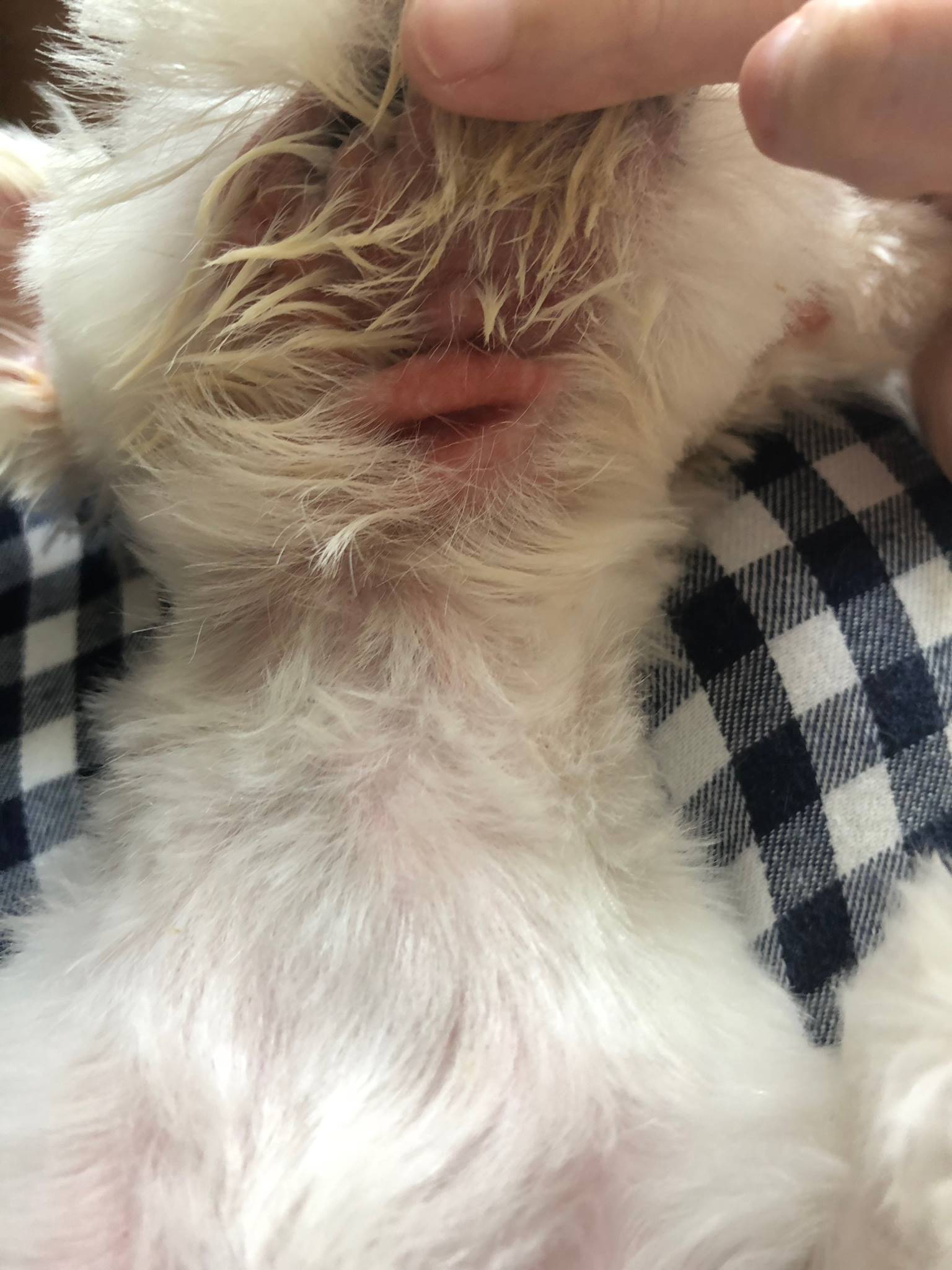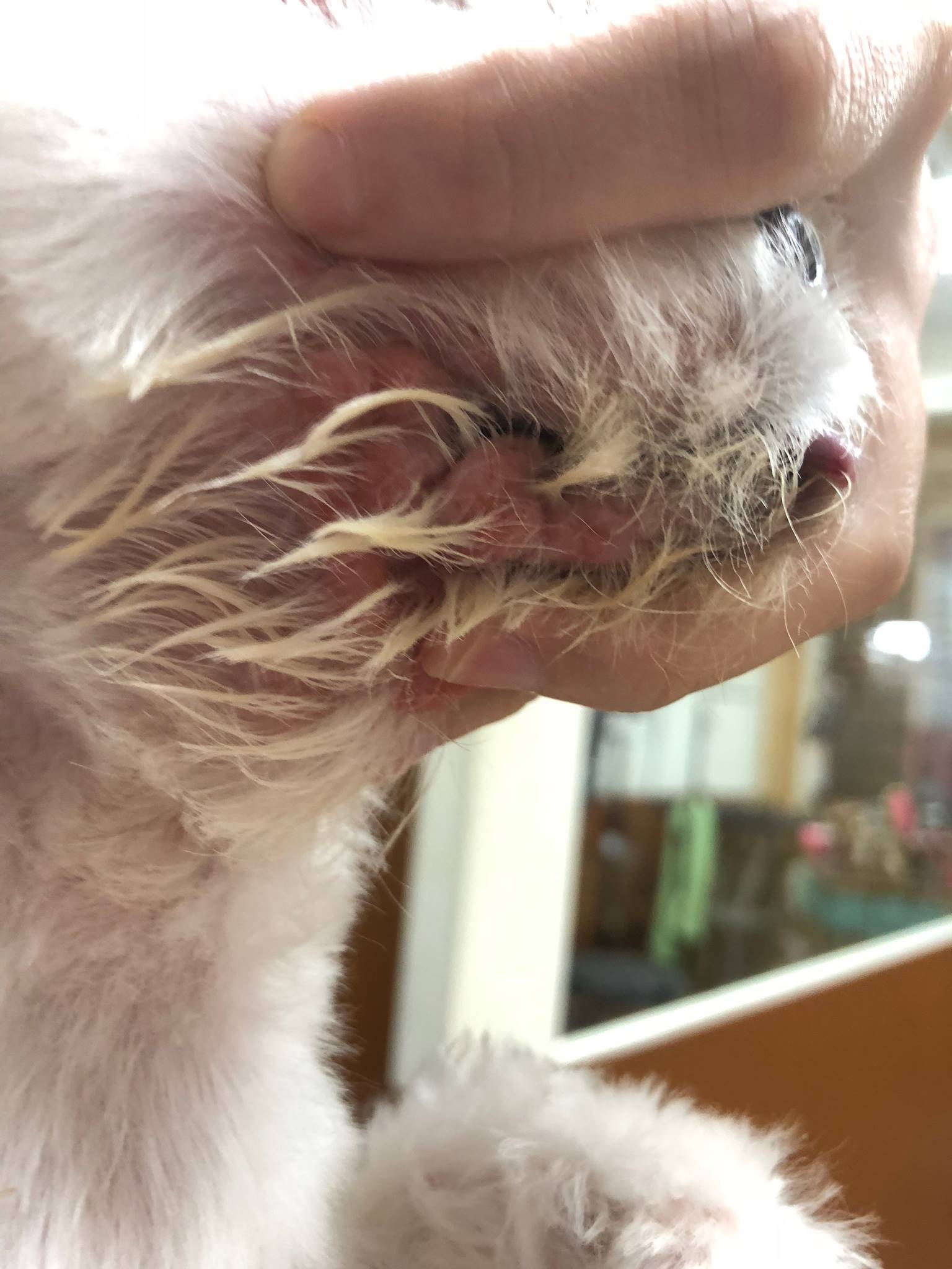 ❎抓下巴、側臉、導致❎下巴傷口、❎紅腫皮屑、❎結痂、❎細箘增長合併著❎耳朵長期發炎的狀況