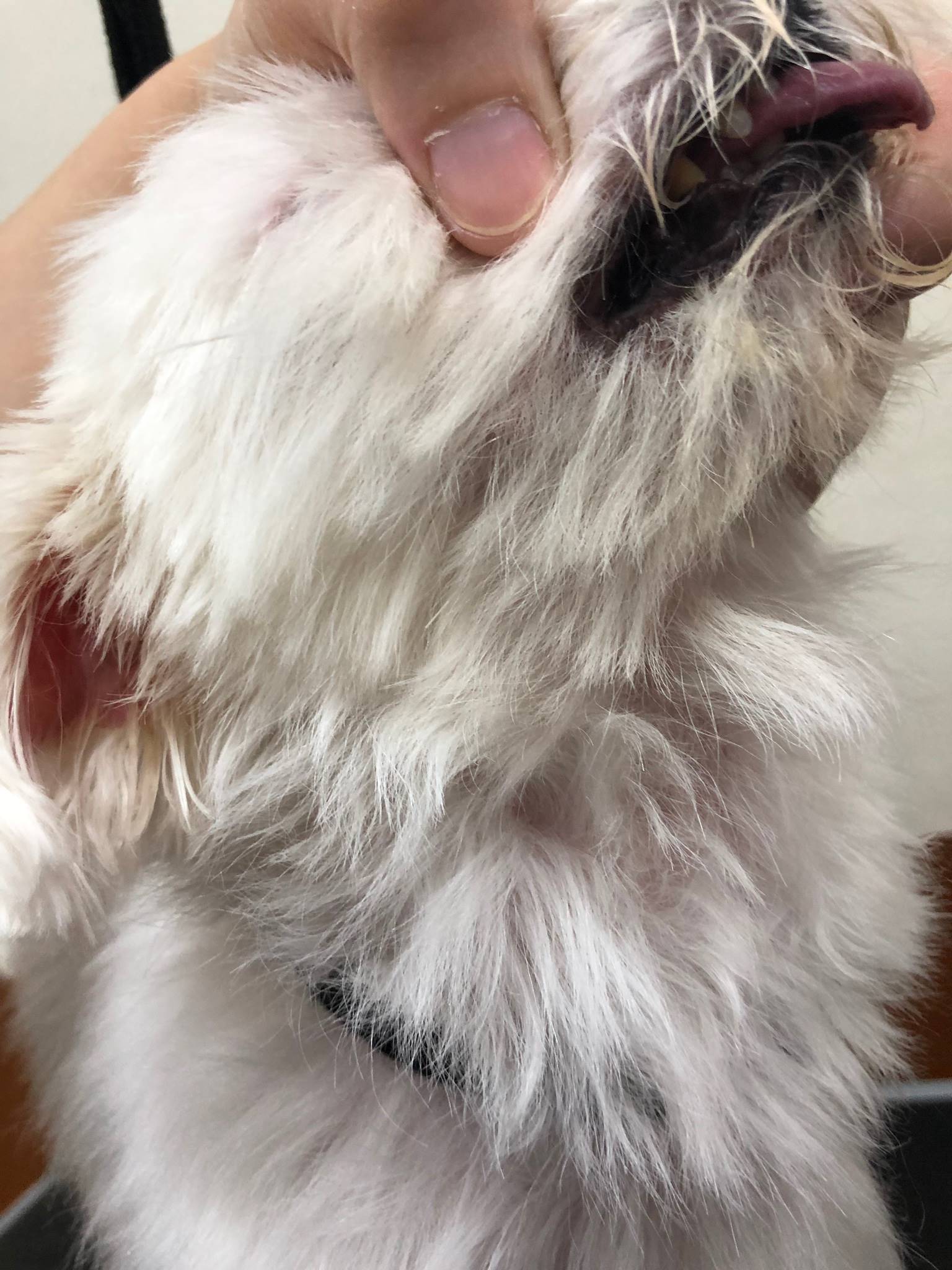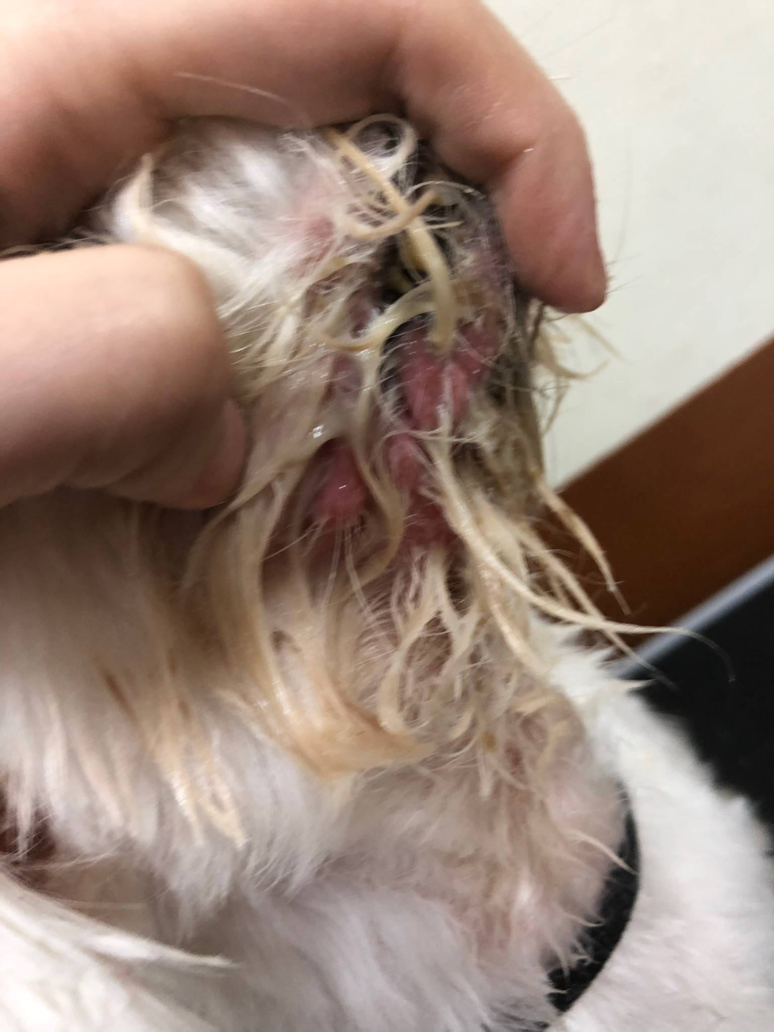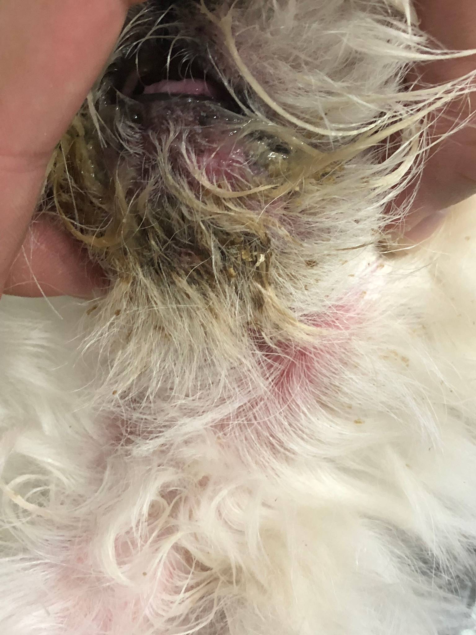 ❎抓下巴、側臉、導致❎下巴傷口、❎紅腫皮屑、❎結痂、❎細箘增長合併著❎耳朵長期發炎的狀況